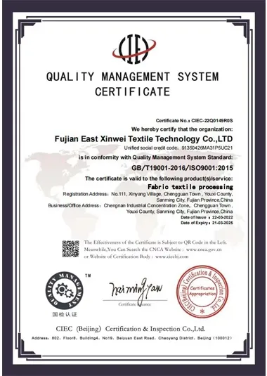 Fujian East Xinwei Textile Technology Co., Ltd. is located in Youxi County, Sanming City, Fujian Province, China, covering 83,000 square meters and equipped with over 200 knitting machines. For more than a decade, we have upheld the principle of “Quality First,” and our products are now distributed worldwide. Our fabrics are primarily exported to the European Union and North American markets, where they continue to receive strong, positive feedback.